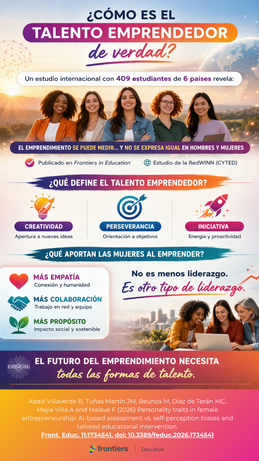 Acabamos de publicar en Frontiers in Education un estudio junto a 6 universidades de la Red Winn que aporta una idea potente: el emprendimiento puede entenderse —y medirse— a partir de competencias socioemocionales que se reflejan en el lenguaje. En este estudio, con una muestra internacional de estudiantes de 6 países (Argentina, Bolivia, Colombia, Ecuador, España y Perú) , se han integrado autoinformes tradicionales con el modelo de inteligencia artificial de Human AI Tech capaz de inferir 35 facetas de personalidad a partir de texto libre.